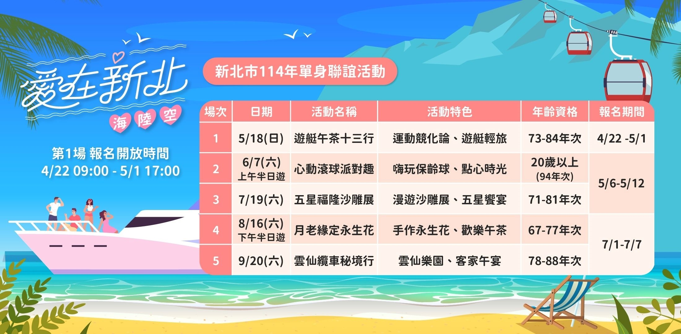 藝點新聞Chloe編輯整理為打造適齡婚育友善城市,新北市114年單身聯誼活動即將展開,今年主題為《愛在新北 海陸空》,帶領單身男女暢遊新北特色景點。首場「遊艇午茶‧十三行」活動即將於4月22日上午9時開放報名至5月1日下午5時止,邀請60位單身男女共赴一場融合文化與浪漫的尋愛旅程,在淡水河畔遇見心動的緣分。(示意圖/Pixabay)民政局長林耀長指出,自102年辦理單身聯誼活動以來廣受好評,113年共有477位民眾報名參與,成功配對133對,配對率逾5成。今年特地設計兼具趣味與互動的主題場次,包括:遊艇午茶十三行、心動滾球派對趣、五星福隆沙雕展、月老緣定永生花及雲仙纜車秘境行,期盼透過戶外體驗、桌遊競賽與DIY手作等多元交流方式,讓參加者在輕鬆自在的氛圍中結識彼此。另外,今年活動首次採取抽籤方式遴選,將於報名截止後由主辦單位進行審查與抽籤,正取男女各30人,其餘列為備取名單。錄取原則依序以設籍於新北市者優先,其次為在新北市就業或就學者。而曾參加113年活動者或重複報名者則列為備取。每位參加者一年內僅能錄取一次,盼更多人都有機會認識新朋友、開啟愛情之門。民政局補充,參加者有機會獲得星巴克雙人下午茶、電影票、可愛小熊等精美好禮。為鼓勵參加者積極追求幸福,新北市也設有戀愛加值計畫,只要參加同場次單身聯誼(含過去場次),並步入婚姻之新人,將有增額錄取本市聯合婚禮的機會。詳細資訊請上民政局官網查詢。(圖/新北市政府提供)延伸閱讀公職女請生理假 主管叫她「提出證明」:下午去妳家訪視全身疼痛竟是「公主病」?5旬婦靠這療法擺脫折磨