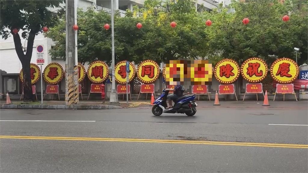 紅黃色的祝賀花圈在馬路邊一字排開,總共11個,色彩鮮艷耀眼,不過往旁邊一看,這花圈擺設的地點居然是在一所國中校門外,上面的字樣,寫著慶祝同學順利畢業,下方還有家長姓名,因為隔天就是學校的畢業典禮,為了慶祝自己就讀國三的女兒畢業,這位家長送上超大花圈,給予祝福。附近民眾:「還蠻特別的,因為我第一次看過,因為很少人會在學校擺放這些啊,起先我是覺得還蠻搞笑,這個同學的爸爸搞笑的廣告嗎。」送花圈家長:「就是想給小朋友難忘的畢業典禮這樣,她說還蠻開心的,就是特別就是一個不一樣的感受。」