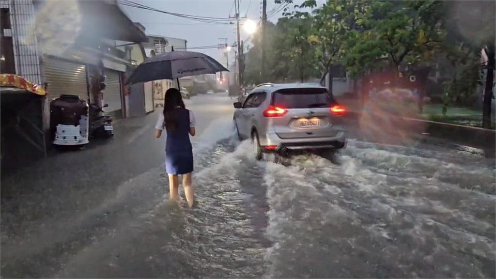 台南南區大雨狂下,雖然啟動抽水機仍無法順利排水。(圖/民視新聞)傍晚下班時間,台南大雨下個不停,路面上滿是積水,車子開過還會濺起陣陣水花,剛下班的女子撐著傘,雙腳泡在水中艱辛的往前走,因為此時水已經淹到了人的小腿肚。民眾vs.記者:「傻眼啊很傻眼對,車子也沒辦法過來喔,沒辦法過來都泡水了。」民眾vs.記者:「不曾淹過這樣欸,不曾淹過這樣喔淹到這來了,對對現在車如果開進去,(水)就跑進去裡面了。」