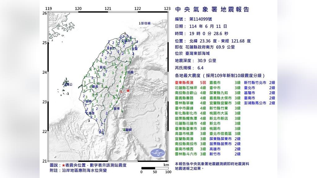 根據氣象署地震報告,根據中央氣象署資料顯示,今天晚上19時00分在台灣東部海域發生芮氏規模6.4地震,地震深度為30.9公里,震央位於花蓮縣政府南方69.9公里,東部5級、花蓮4級、南投4級、嘉義4級、雲林4級、台中4級,彰化4級、苗栗4級、高雄3級、宜蘭3級、台南3級、屏東3級、新竹3級、桃園3級、台北3級、澎湖2級。