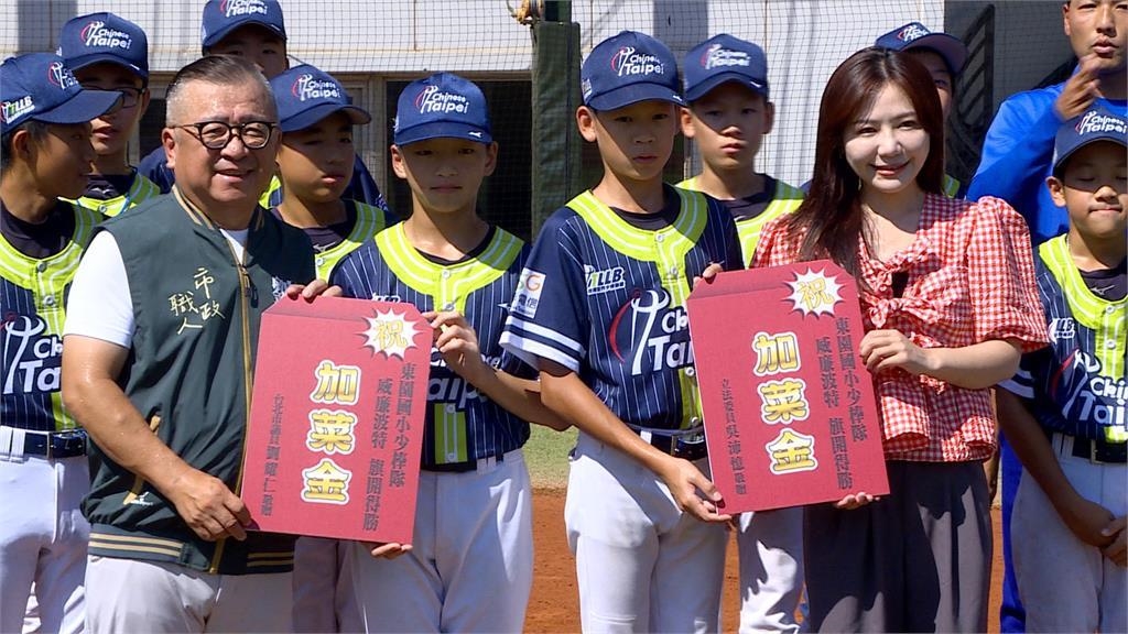 全力衝刺、積極備戰,北市東園少棒,8月即將代表台灣,遠征美國威廉波特,民進黨立委吳沛憶,以及前一天才從德國世大運回國的體育署長鄭世忠,特地獻上加菜金和應援小物。
