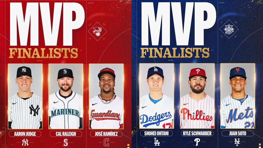 MLB美國職棒大聯盟今(11/4)公布年度獎項決選名單,MVP部分國聯大谷翔平要力拚三連霸、美聯洋基隊長「法官」賈吉(Aaron Judge)則要面臨全壘打王水手重砲捕手勞雷(Cal Raleigh)的強力挑戰。