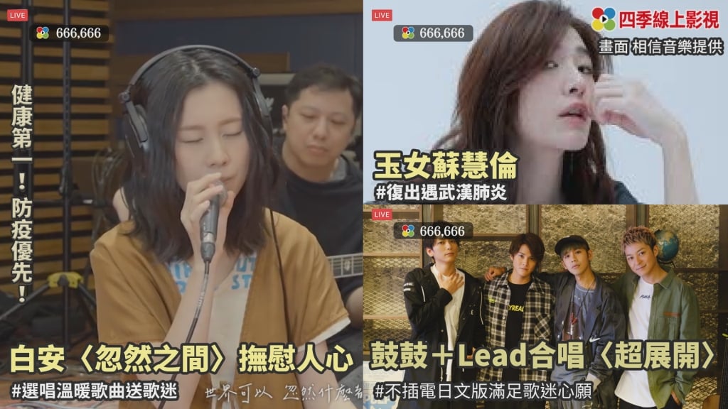 「90s首席怪潮玉女」蘇慧倫、「全創作唱跳歌手」鼓鼓呂思緯與「創作精靈」白安原訂在2月28、29日以及3月1日在台北新光三越信義香堤大道廣場舉辦的連續三天三場演唱會,因武漢肺炎疫情日趨嚴峻,忍痛取消唱會,三位歌手改成透過直播的形式與歌迷聊聊天、唱唱歌,為演唱會特別來台的日本人氣唱跳男團Lead加入鼓鼓的直播陣容,線上與歌迷互動同樂。