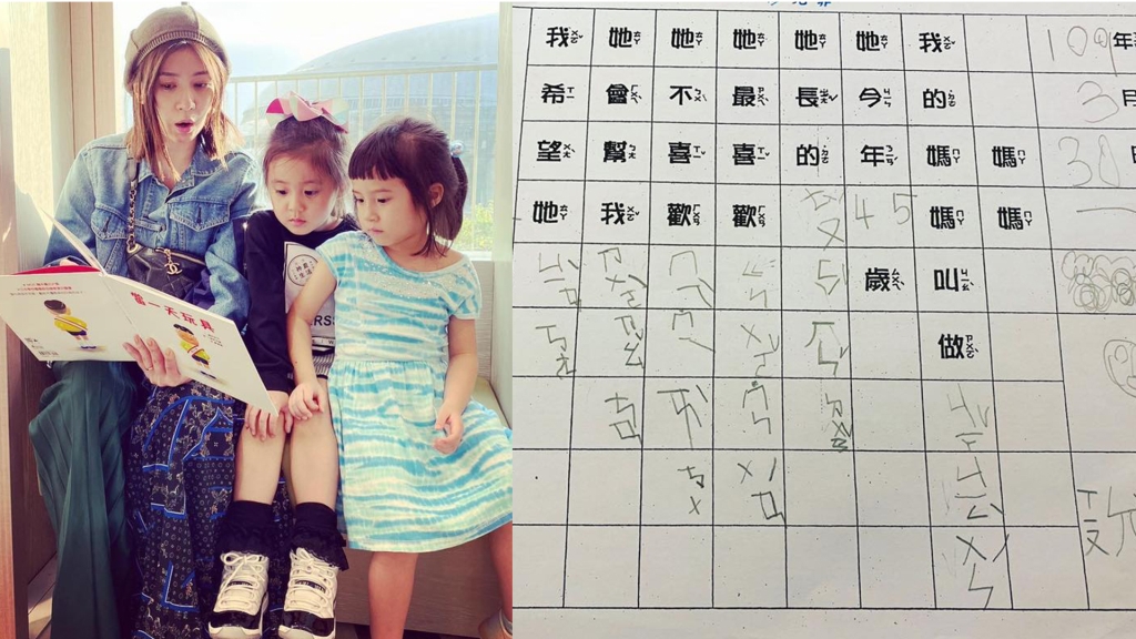 賈靜雯在臉書上PO出咘咘的作業,咘咘以稚嫩的注音文寫著「我的媽媽叫做賈靜雯,她今年45歲,她長的頭髮很短,她最喜歡跟我們玩,她不喜歡妹妹愛哭,她會幫我做早餐,我希望她健康」。