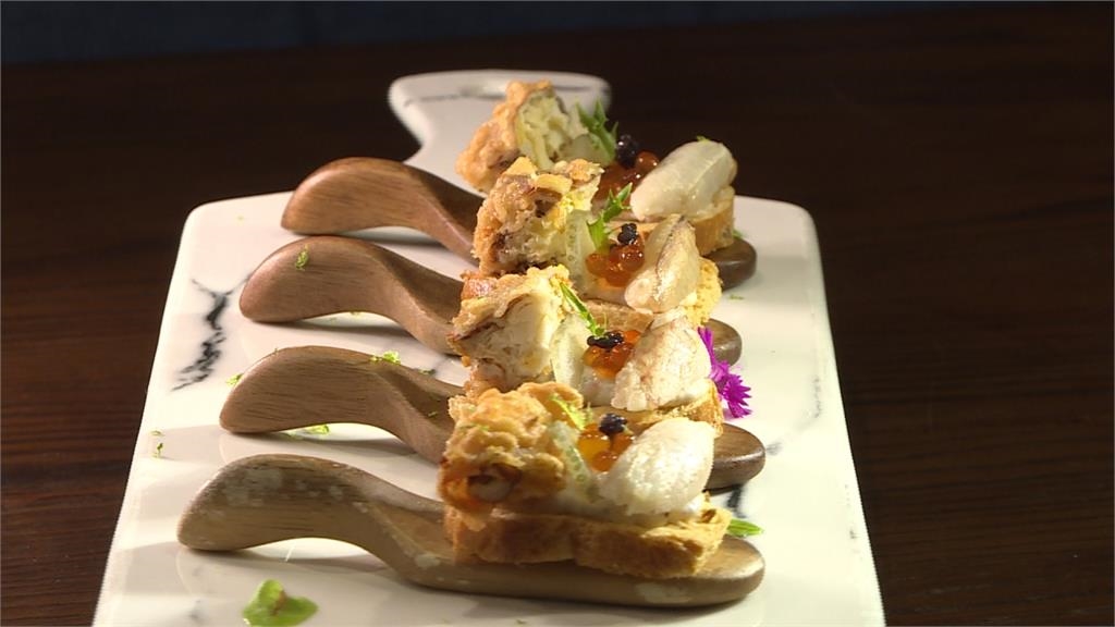 再品嚐海味小艇,一口吃到蟹管肉、酥炸軟殼蟹兩種口感。中菜融合西餐元素,風味、口感顛覆大眾想像。