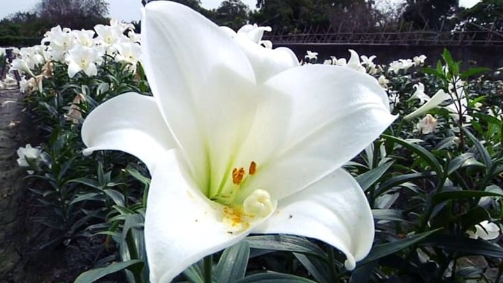 充滿童趣的長頸鹿頭上戴了一把百合花,它就置身在一片雪白的花海中,鏡頭再拉遠一點,是三合院老屋,古厝與白花相映成趣,隨手一拍都夢幻。百合花田位在雲林縣四湖鄉參天宮附近,土生土長的鄉民吳國祥夫妻,花了20多年在住家旁邊打造一分地的百合花田,上萬朵百合每年5月如期盛開,今年也沒有失約。吳家夫妻愛花,本來是種來讓自己開心也美化環境,不過3年前有民眾路過發現,賞花之後拍照上傳網路分享,名氣就這樣傳開來。
