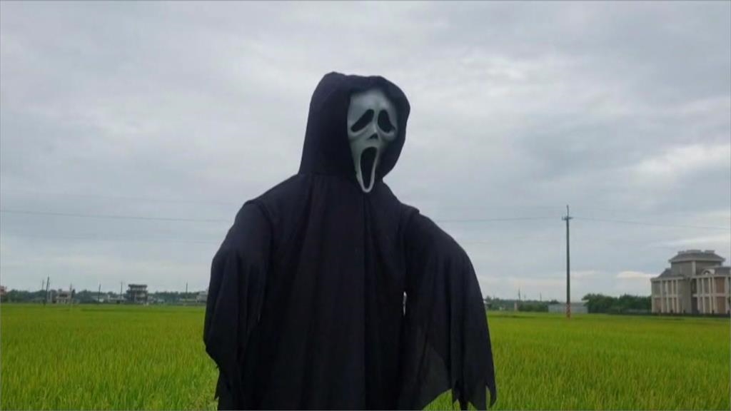 但提到嚇人,明明不是農曆7月半,田裡的這位老兄黑色衣服飄啊飄,下面沒有腿,上頭的臉居然是電影驚聲尖叫的「鬼臉」。