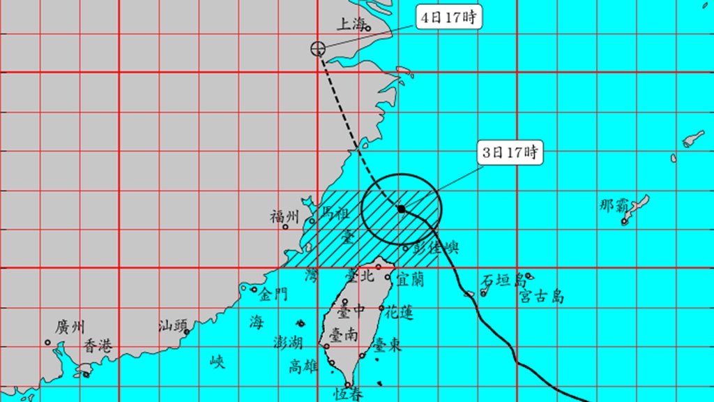 氣象局預測,明4日17時哈格比的中心位置在北緯 30.6 度,東經 120.0 度,即在馬祖的北方約 490 公里之處。