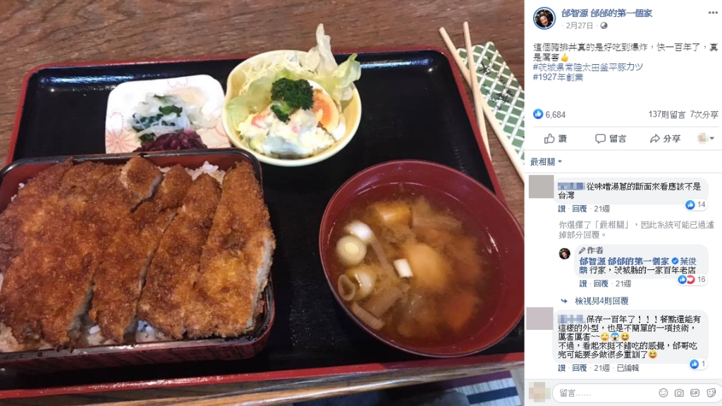 這裡的豬排使用當地醬油醃製,炸得外酥內嫩,淋上百年傳承的甜醇醬油,再搭配上熱騰騰的米飯一同入口,香氣十足又不油膩,就連藝人邰智源吃過都讚不絕口,忍不住在臉書上和粉絲分享好滋味。