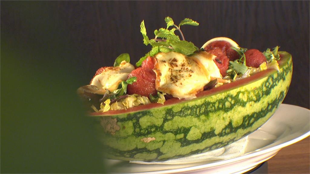 消暑的西瓜也有新吃法,台北有餐廳把西瓜球炭烤,去掉多餘水分,濃縮甜度,而墨魚沙拉則是搭配上黑色的薯泥,業者推出創意料理吸引消費者目光。