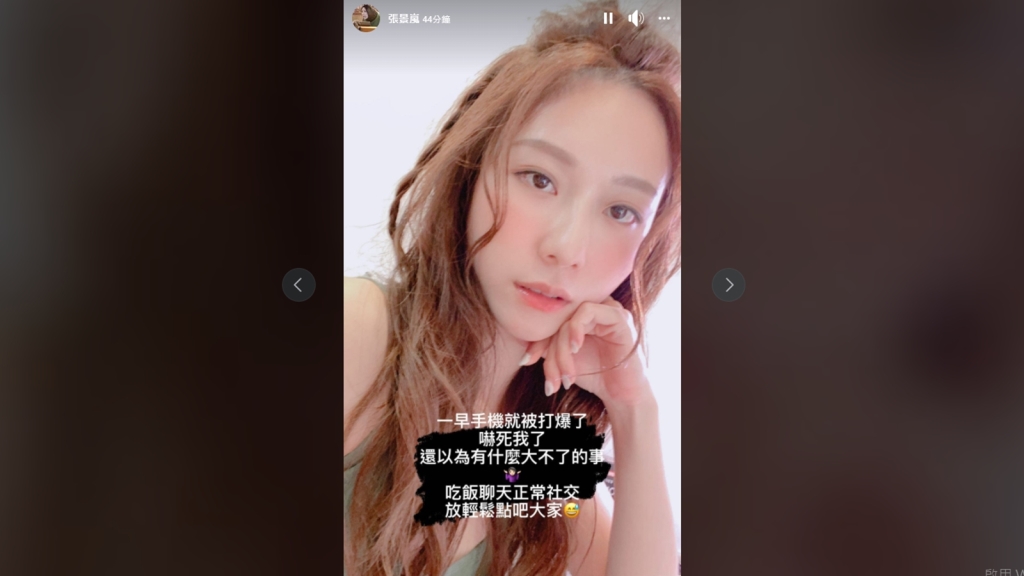稍早張景嵐也在IG限時動態回應了:「一早手機就被打爆了,嚇死我了,還以為有什麼大不了的事,吃飯聊天正常社交,放輕鬆吧大家。」
