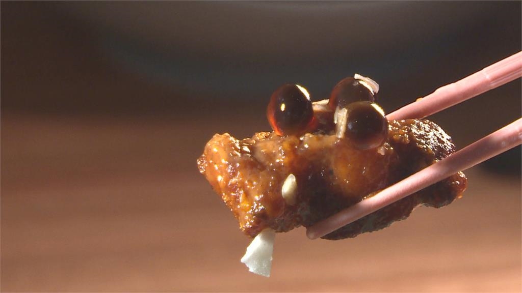誰說泰奶只能用喝的,變身泰奶排骨,讓甜飲瞬間變鹹食,一入口,濕潤排骨,吃嚐到泰奶的香甜茶味,中心是醃漬排骨的鹹香,還點綴珍珠,一口口把珍奶吃下肚。排骨油炸,為了增加茶香,醃漬時還拌入茶葉、茶水,高溫炸到金黃。