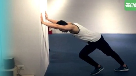 1.面對牆,一條腿伸直往後延伸,另一條腿向前伸膝蓋微彎。