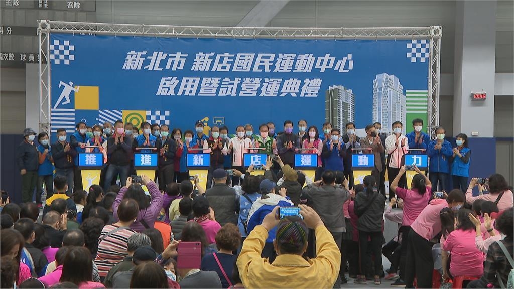 新北市長侯友宜在舞台上,和其他民代一起推動手中的握把,象徵新店國民運動中心正式開放,這也是新北市第16座運動中心,一大早,門口就湧現排隊人潮。