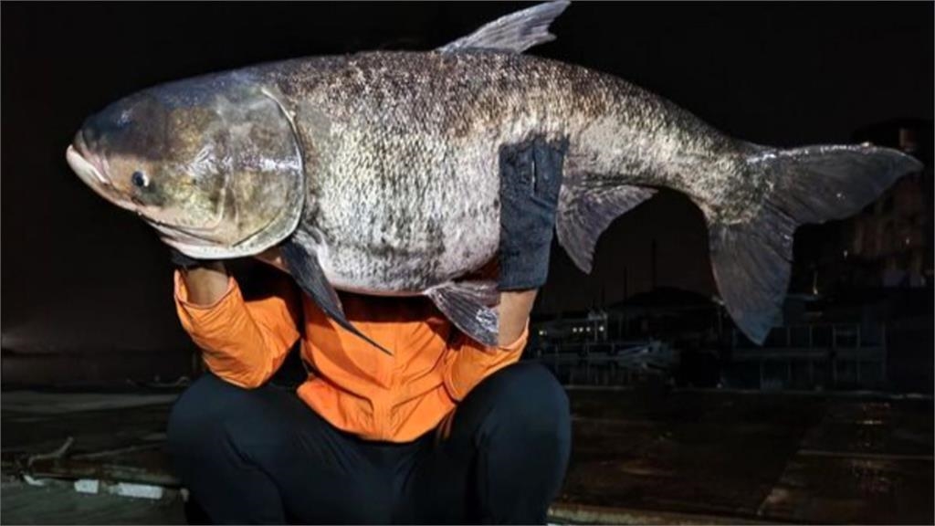 人把魚舉起來,結果人的頭部到肩膀,全都被魚身遮住,在日月潭這名李姓釣客,在9日當天,釣起重達42台斤的大頭鰱,長度大約130公分。