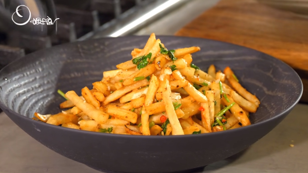 回炒薯條重點在於本來是濕的,在鍋子裡聲音是沉的、悶悶的,在炒烘的過程當中,開始會覺得變得比較硬、變得乾乾的。因為薯條本身是炸的,所以在炒的過程中,它的油脂慢慢加熱、就會跑出來,所以不用再加油。