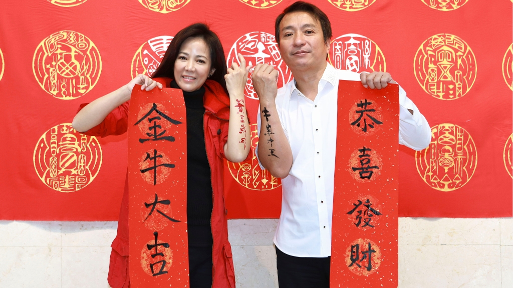 書畫鬼才黃明勝老師昨特地在陳仙梅、王中平手臂上揮毫,寫下「黃金歲月、牛氣沖天」的祝福賀詞,陳仙梅笑說可以體會到粉絲握到手,不想洗手的感覺,看到老師替自己手上寫字,感覺特別不一樣。王中平則開心說寫上去涼涼的,但很像跟自己融為一體,打趣說很榮幸自己的手臂能夠發揮作用。