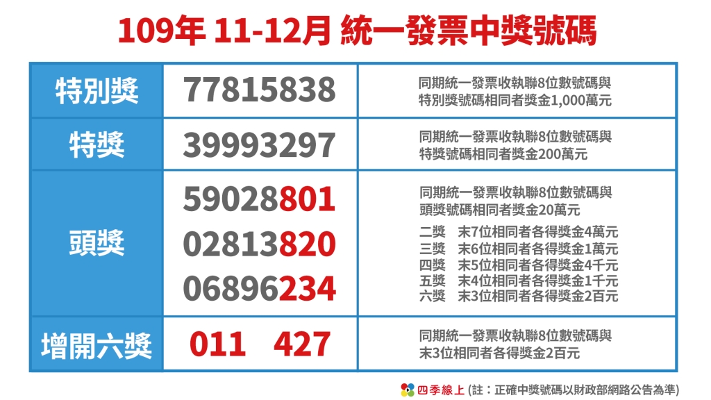 本期中獎民眾自110年2月6日起可開始兌獎,領獎期限至110年5月5日止。