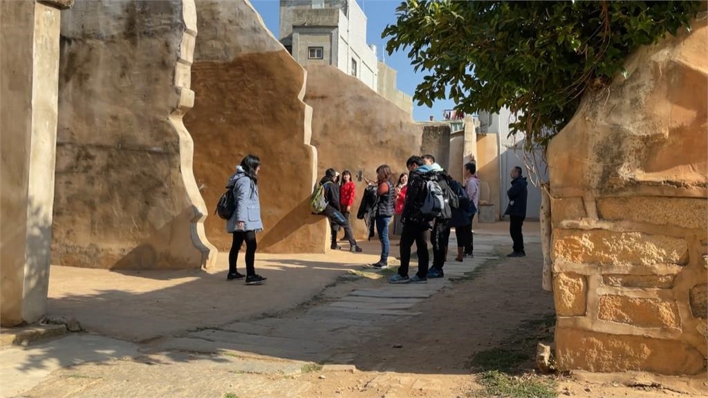 遊客絡繹不絕,不同於金門經典的磚瓦紅牆、閩式建築,這裡的古老城牆,因為金門縣政府推動加固工程,全被塗上了黃色的灰泥,就像滾滾黃沙覆蓋一樣,有人買單這種大漠風格,但也有在地居民認為,傳統特色消失了,實在很可惜。