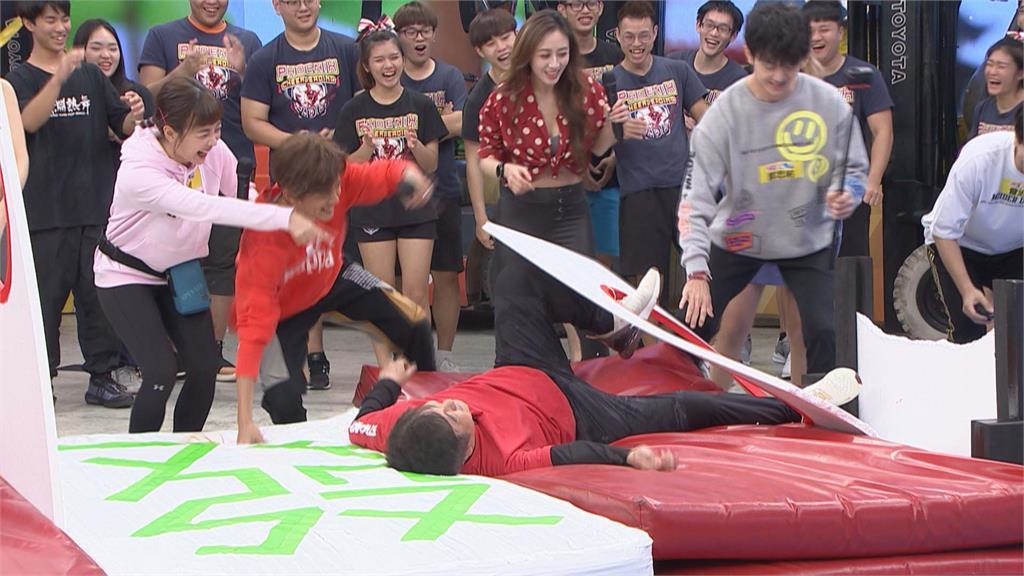 除此之外最夯單元「超人來了」,要站在軟墊旁學超人姿勢右手舉高立定跳遠,臉朝下趴在軟墊上,看誰跳得比較遠,綜藝大哥胡瓜也沒在怕,直接PK小鮮肉童韋傑,只見童韋傑飛跳超遠,胡瓜像是直接跌倒在軟墊上,臉朝下的他還爬不起來,搞笑又努力挑戰遊戲的精神讓眾人佩服!