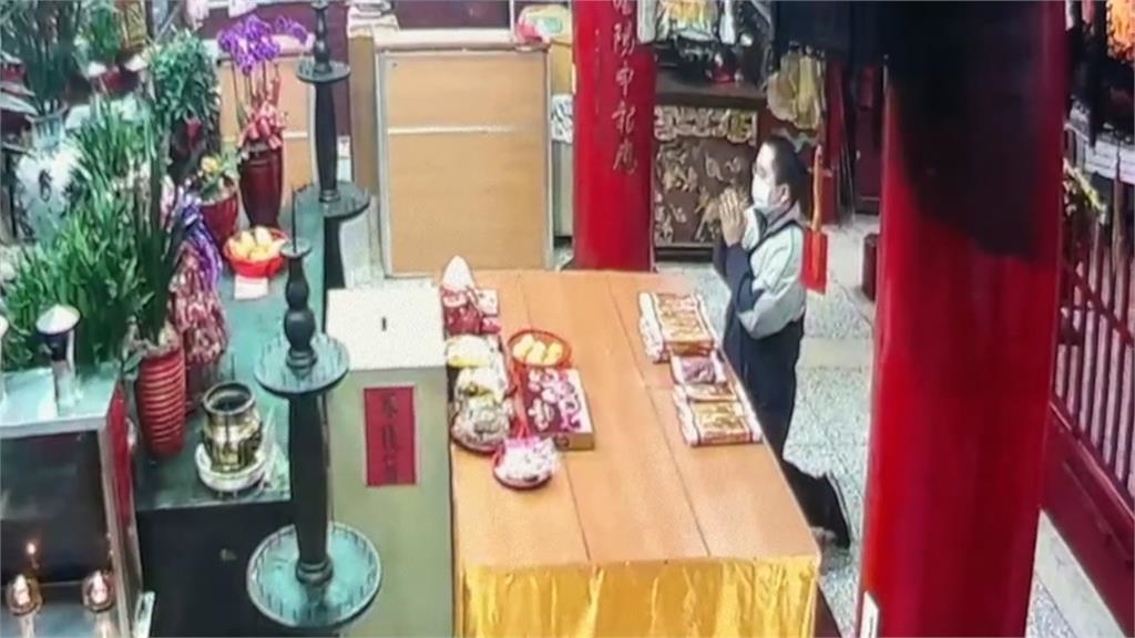 只見一名男信徒雙手合十,誠心跪在廟前參拜,向眼前的東嶽大帝擲杯,信徒雙手一拋,沒想到杯沒掉到地上,竟然直挺挺的就卡在飄逸的神桌桌布上。男信徒傻了眼,左看右看,不敢相信自己的眼睛,而其他信徒也走過來一探究竟,對眼前景象嘖嘖稱奇。
