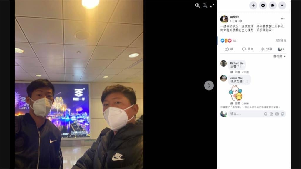 網協代理秘書長王凌華說,「也還好在我們土耳其代表幫助之下,協助曾俊欣今天凌晨,搭乘土耳其的班機,再轉乘長榮班機,已經在5點31分的時候,順利抵達桃園國際機場。」
