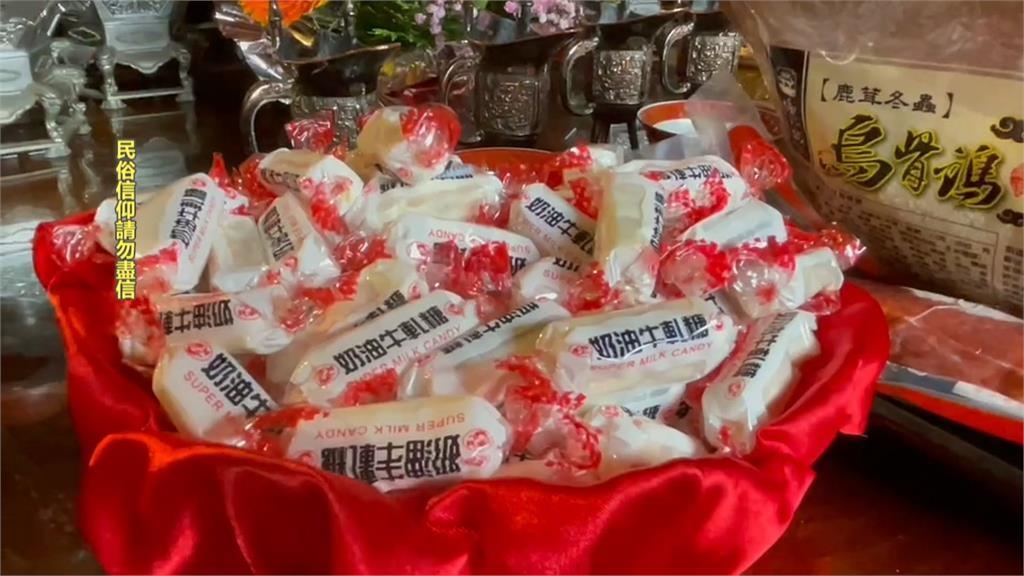 只是令人好奇的是,拜文昌帝君蔥、芹菜,代表聰明、勤快,但桌上卻還有牛軋糖,怎麼回事?