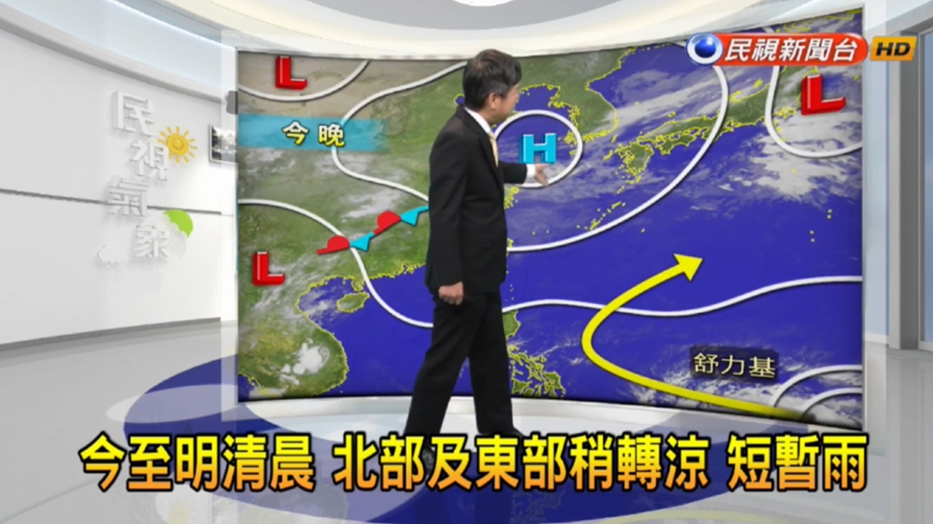 今、明(14日、15日)兩天東北季風影響,今日北部及東北部天氣較涼。而原位於菲律賓東南方遠海的熱帶性低氣壓,已於今天凌晨2時增強為今年第2號颱風「舒力基」,早上8點中心位於鵝鑾鼻東南方2370公里的海面上,短期內移速緩慢,之後逐漸加速朝西北方向前進,來到菲律賓東方海面後有較高的機率開始北轉,隨後朝東北方向前進,對臺灣沒有直接影響