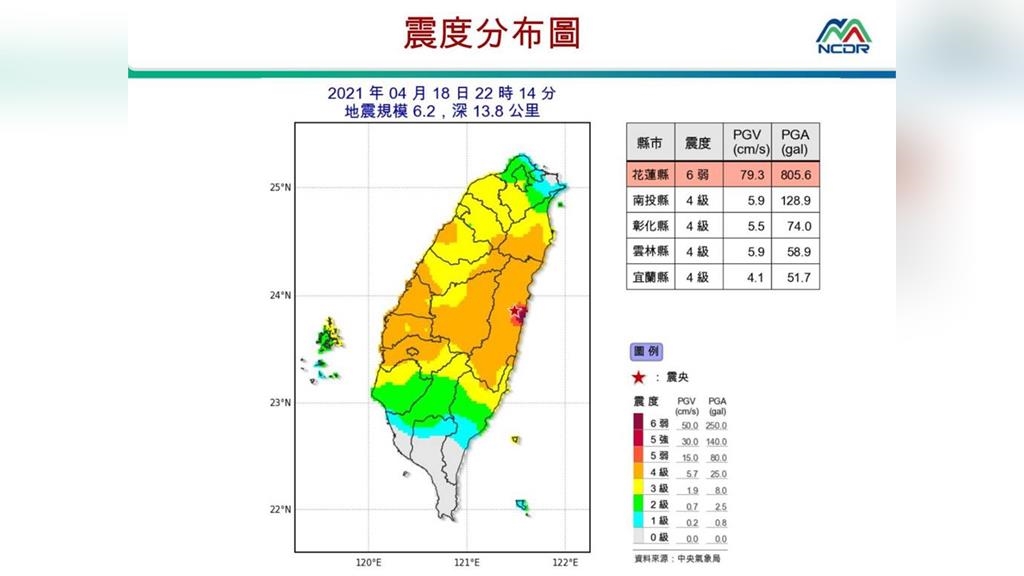 晚上兩次大地震分別發生於22時11分規模5.8,及22時14分規模6.2,花蓮震度都來到罕見的5強及6弱。