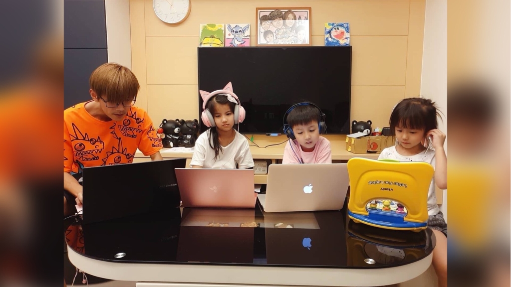 全國停課不停學進入第四天,兩人為了安排停課小孩的生活,各出奇招,阿翔的大女兒小泡芙(小二)與二兒子布朗尼(大班)學校都有遠距教學上課的安排,小女兒舒芙蕾(4歲)看大家都要用電腦上課也吵著要,阿翔就拿玩具電腦給她,一家四人同時用電腦成了奇特畫面,下午阿翔則忙著在自家小陽台佈置成野餐的氛圍,讓三個小寶貝也有外出玩樂的假象,滿足一下不能出門玩的鬱悶心情,大女兒開心的說「哇!我們家也有公園」。