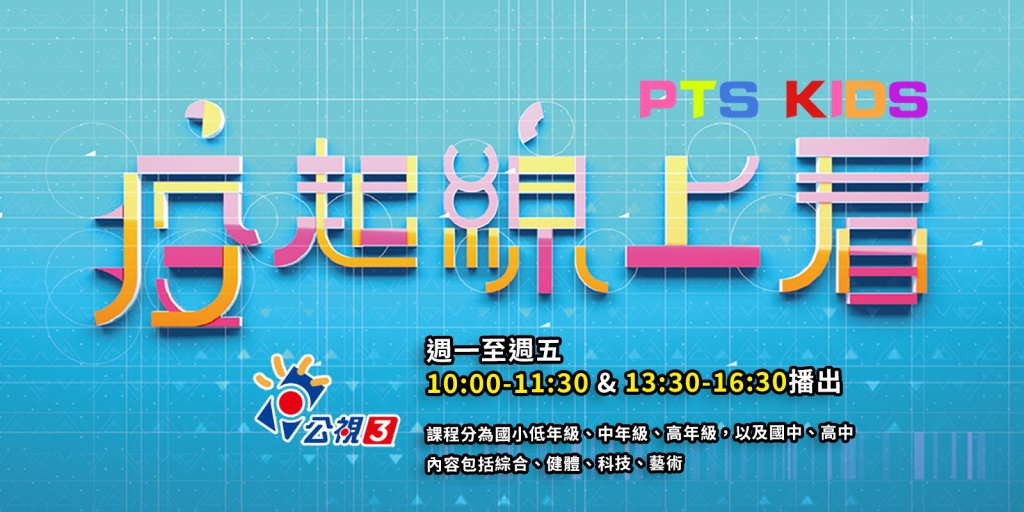 公視三台於5/19起,推出「疫起線上看」教學節目也同步延長播出,家長可依照孩子的年級收看適合的節目,內容涵蓋中小學藝術、綜合、健體、科技等4個學習領域,各校可列為正課,折抵上課時數。