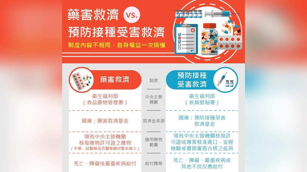 藥害救濟基金會也特別製作一張「藥害救濟」與「預防接種受害救濟」比較圖,希望讓民眾了解,兩者制度內容不相同,希望民眾搞懂自身權益,並提醒民眾,若是施打疫苗產生不良反應,請向地方衛生局或疾管署諮詢。