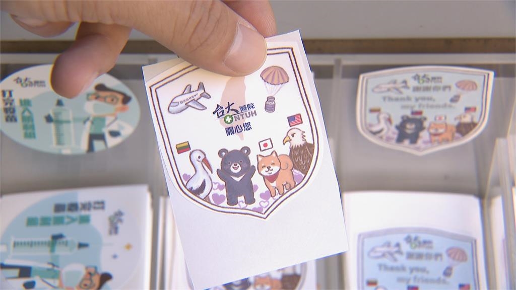 貼紙上印有4隻Q版動物,分別代表立陶宛的白鸛、台灣黑熊、日本柴犬以及美國老鷹,上頭還有降落傘。感謝3個國家熱心捐贈疫苗,首批限量5千張,長駐台灣的德籍記者,就在推特PO文分享,開玩笑說這可以做成一系列卡通,腦中已經有反派角色想法,還加碼貼出柏林熊照片自嘲,德國這次錯失了出鏡機會,也許得考慮下一季,這次疫苗貼紙小物,意外夯到國外,讓院方也很驚訝。