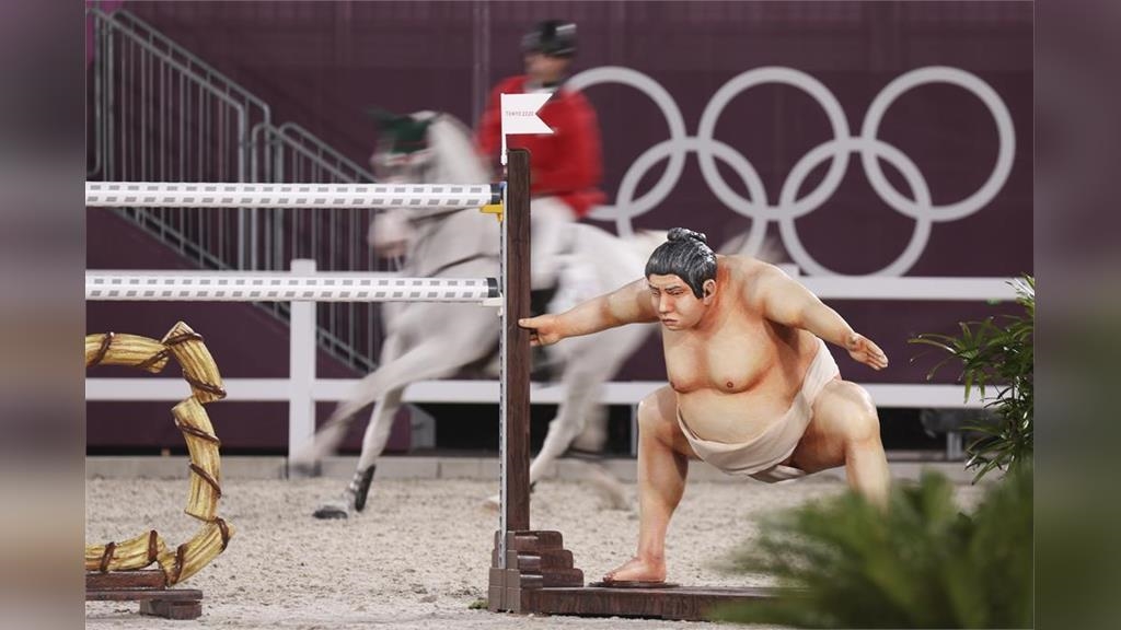 據美媒《美聯社》報導,這座相撲選手雕像,在馬術個人場地障礙賽的第10處障礙,通過障礙時,參賽選手跟馬匹都會看到這個相撲選手雕像的背面,這座雕像還呈現「準備進攻」的姿勢。因為馬術比賽講求「人馬合一」,所以參賽馬匹都需要很長時間的訓練,讓牠們不容易受驚嚇,但這個逼真的相撲選手雕像,非常可能使馬匹受驚。