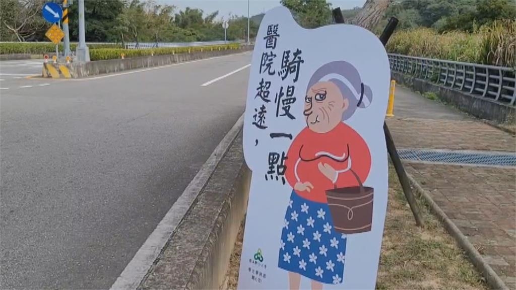 苗栗市聯合大學附近,5年來發生至少130件學生傷亡車禍,為了避免車禍一而再的發生,校方設置Q版阿嬤立牌,提醒學生騎車慢一點。