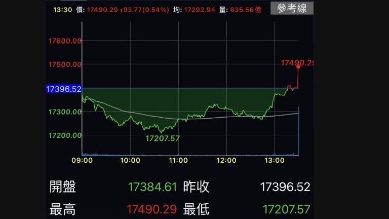 台股加權股價指數終場上漲93.77點,收在17490.29點,漲幅0.54%,台股連續7個交易日收紅,成交值在最後一筆大量助攻下達3353.01億元;累計8月台股22個交易日,有17天交易量低於4000億元水準。