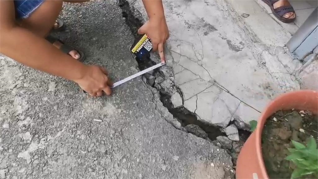 受害住戶表示,「昨天在裏面就是聽到,奇怪怎麼一直有水聲也沒下雨,出來看是裏面的土都坍下去了,你看整個裂開了,所以他們出來都很害怕。」