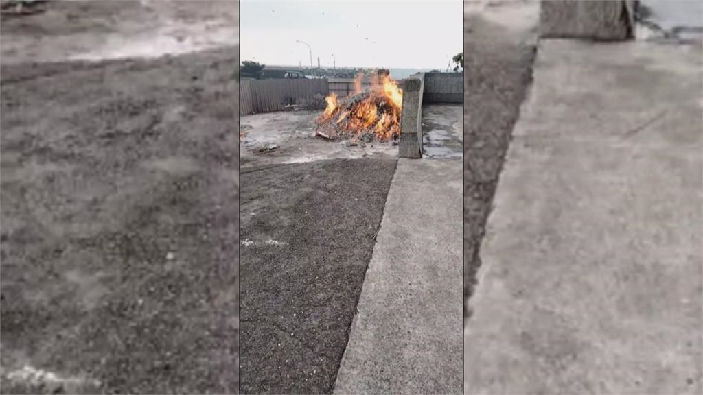 空地上,大火熊熊燃燒,仔細一看,竟然是在燒金紙,附近居民循著臭味而來,錄影存證。