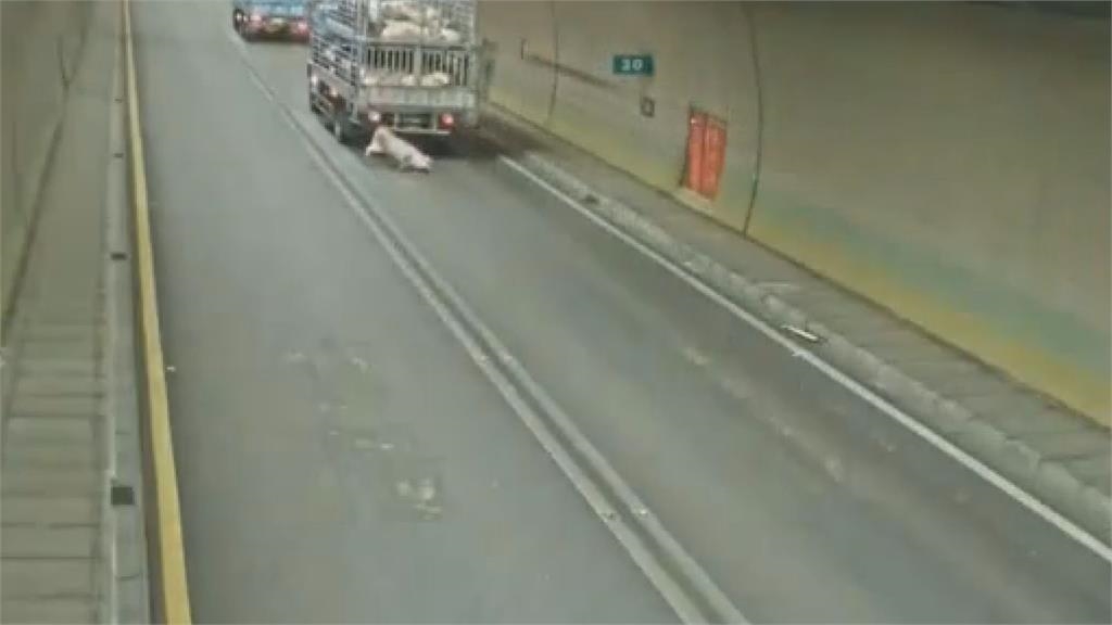 一輛原本要運送豬隻到屠宰場的大貨車,疑似因為車上柵欄鬆脫,導致被擠到最外圍的一隻豬豬,當場滾下車、重摔在地,並在地面上翻滾了好幾圈,但幸運的是,看起來並無大礙,而豬豬也趕緊站起身,在隧道內展開逃亡記,只見後方來車看見後嚇得紛紛閃避、緊急煞車,而用路人也立刻報案。
