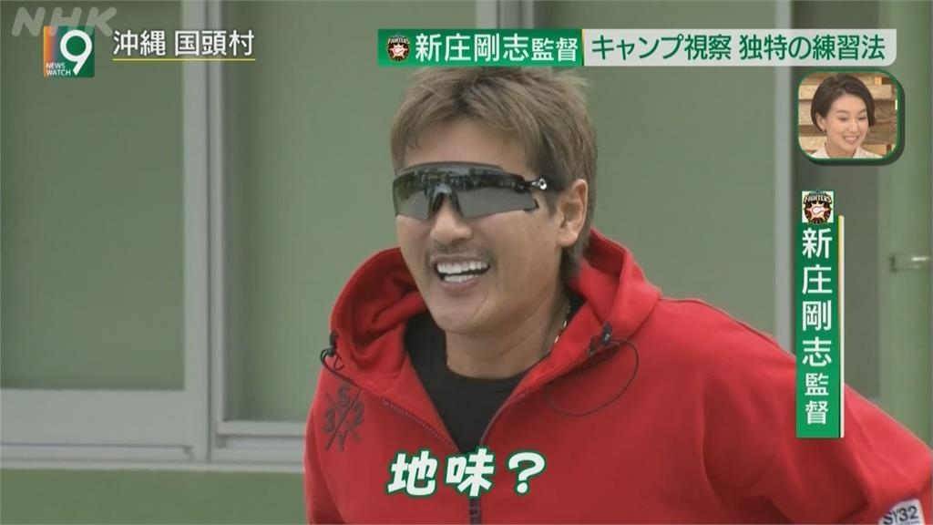 穿著大紅色運動套裝,出現在火腿隊的沖繩秋訓,新上任的總教練新庄剛志,一舉一動都吸引目光。