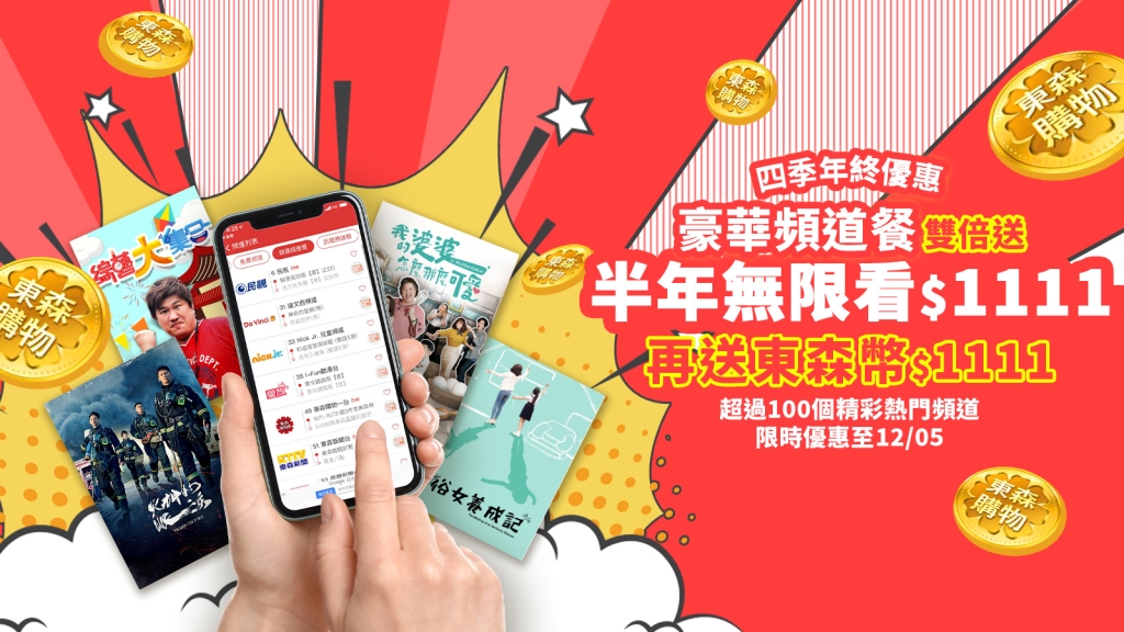 2.活動期間購買【豪華頻道餐】,並以【預付180天】方式付款,可加碼獲贈東森幣$1111 (東森雙11買起來)