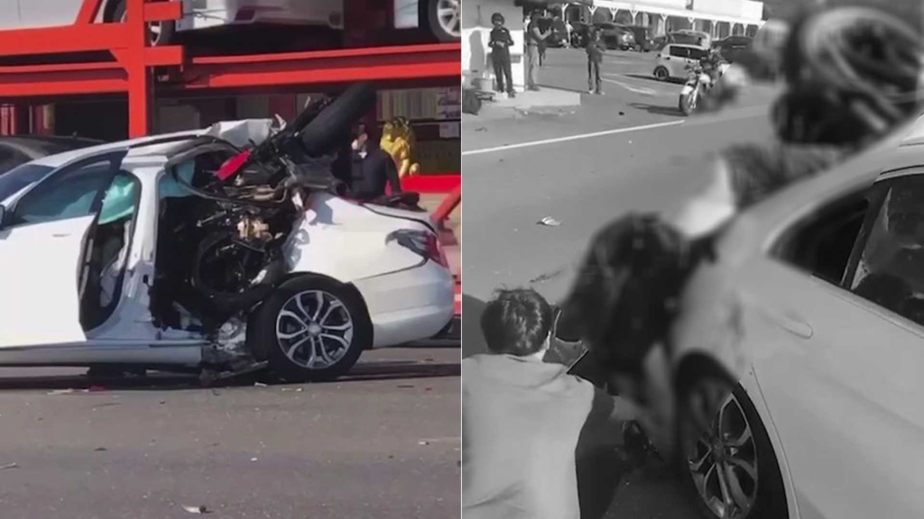 而從曝光的監視器畫面中可見,白色賓士從海豚灣7-11轉往北上車道,小客車駕駛直接橫切過馬路,南下段直行的重機騎士閃避不及,直接撞上轎車的左側後車門,撞擊瞬間冒起濃煙,賓士也因強勁的撞擊力,左側車身整個騰空轉180度,最終停在路中央,而騎士則一頭栽進後擋風玻璃內,上半身更隨著車身左右擺盪,後方車友見狀紛紛路邊停車,打電話報案。