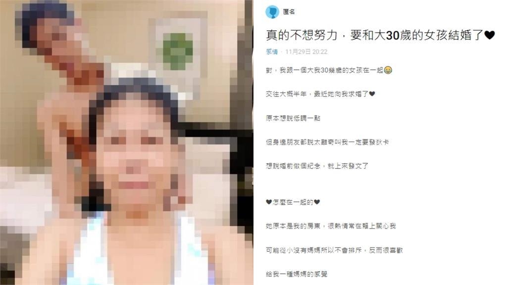 1名網友在《Dcard》以「真的不想努力,要和大30歲的女孩結婚了」為題發文,表示「我跟1個大我30幾歲的女孩在一起,交往大概半年,最近她向我求婚了!」原PO指出「她原本是我的房東,很熱情常在LINE上關心我」,坦言自己可能是因為從小沒有媽媽所以不排斥,反而很喜歡。後來某天女房東與老公大吵,不想待在家所以經常找他喝酒聊天,之後更是與老公離婚,而2人就因此變成了情侶關係。