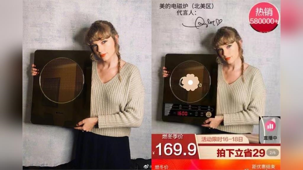 名人代言產品是一件相當普通的事情,雙方只要達成共識就能展開合作;不過中國卻是用「P圖」強迫他人代言!近日網路瘋傳一張國際巨星泰勒斯(Taylor Swift)現身淘寶賣場的截圖,她不僅拿起中國品牌的電磁爐,圖片還聲稱她是北美區代言人;結果被抓包這是P圖,泰勒斯的原圖是手持獎座,讓不少人傻眼。