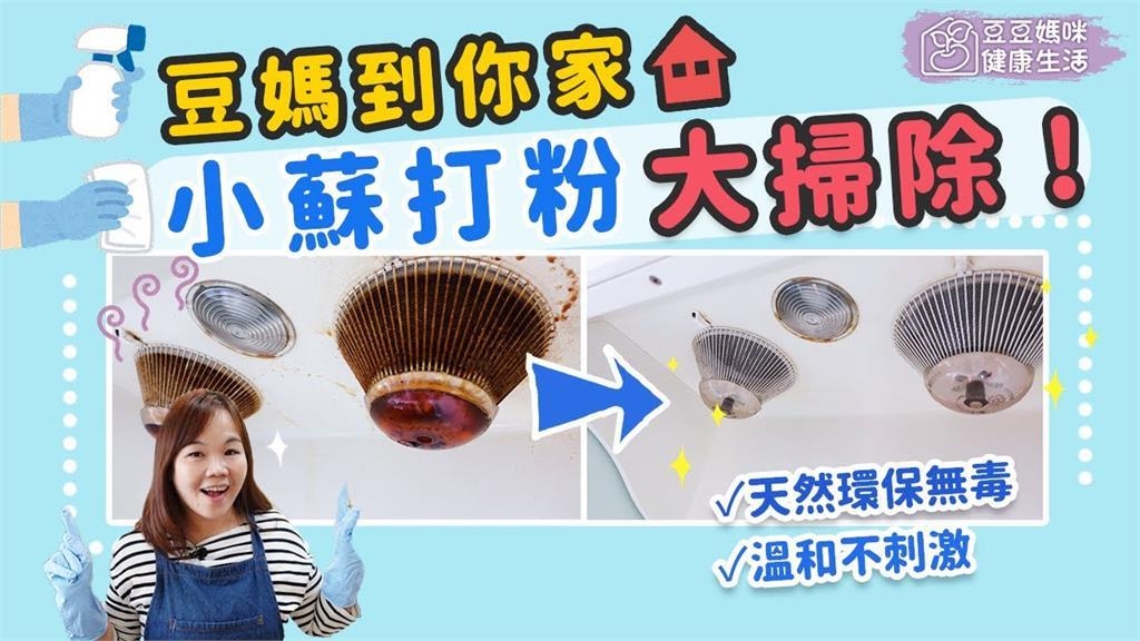 豆豆媽將油網先初步處理後,又將小蘇打粉混水加入噴瓶,一邊噴著小蘇打水,一邊拿著刷具清潔抽油煙機的機身,清潔完機身再將放置一段時間的油網刷洗乾淨並裝回,只見經過她清潔後的抽油煙機,從原本泛黃卡垢變回白亮的機身,令人讚嘆小蘇打粉的功用,而豆豆媽也表示「小蘇打粉天然無毒不傷環境,是大掃除的好幫手」,推薦大家若不喜歡化學清潔劑傷手又有刺鼻味道,不妨考慮以小蘇打粉來做清潔。