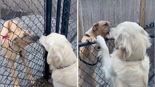 日前主人在TikTok上分享了一段牠們和對方打招呼的影片,只見布魯站在柵欄前興奮地搖著尾巴,而牠會這麼開心就是因為牠的女朋友正從柵欄的另一邊跑過來,兩隻狗狗先是從柵欄的縫隙互相碰鼻子打招呼,接著牠們同時趴到柵欄上面不停舔對方的臉,又抱又親的畫面看起來就像是在演浪漫連續劇!