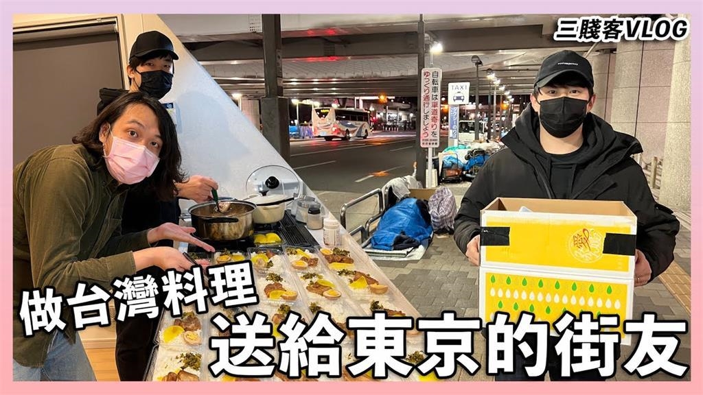 一般人對於東京的印象,大部分都是繁華熱鬧的國際都市,但在高物價以及多種因素之下,同樣也有許多人寄居在街頭。長住日本的台灣YouTuber「池袋三賤客」Sean、Wayne及Taka,在過年期間決定親自做料理,分享給東京的街友們,三人前往超市一邊選購食材,一邊思考該製作何種台灣料理,最後決定煮爌肉便當來分享,當Sean、Wayne及Taka在料理的時候,還一邊爭執著南部及北部的「肉燥、滷肉、爌肉」如何區分,而在便當製作完成後,立刻上街發送,街友們不只表達感謝,還有人當場大口開吃,讓三人直呼「好開心,好像吃的滿香的」,而網友們也留言讚賞他們的愛心「為你們感到驕傲」。