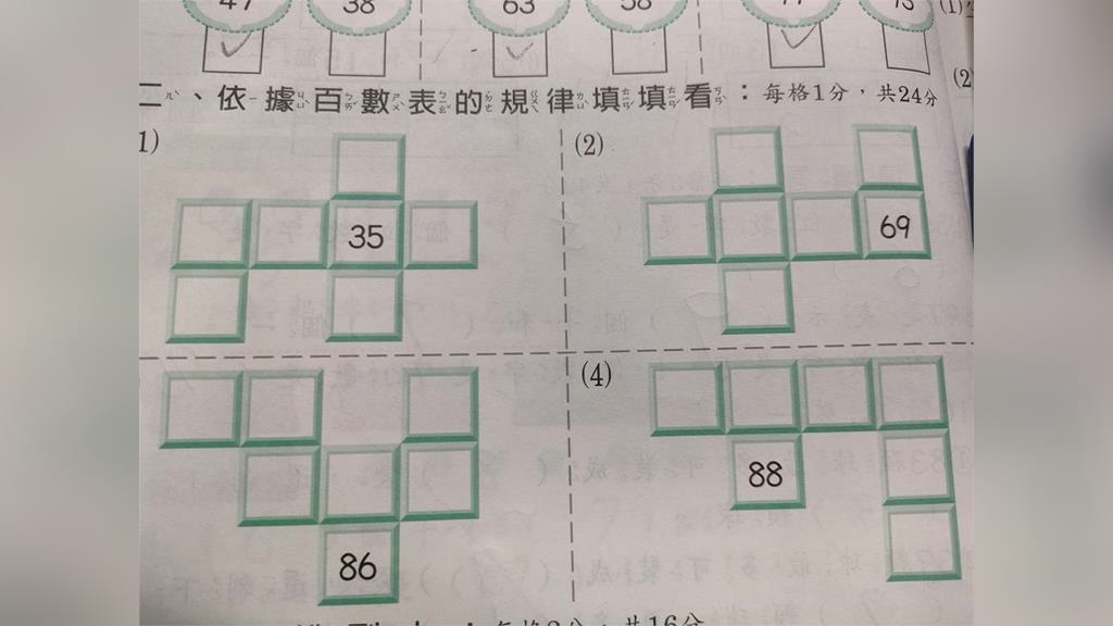 生活中心/李明融報導現在不少小學生的學校作業,可能連父母都會被考倒,近日有網友分享家中國小1年級孩子的數學題目,叫做「百數表」的題目,在沒有範例的前提下,讓原PO感到相當崩潰,貼文曝光引起許多迴響,正確答案到底怎麼寫?超過千名網友也熱烈討論。