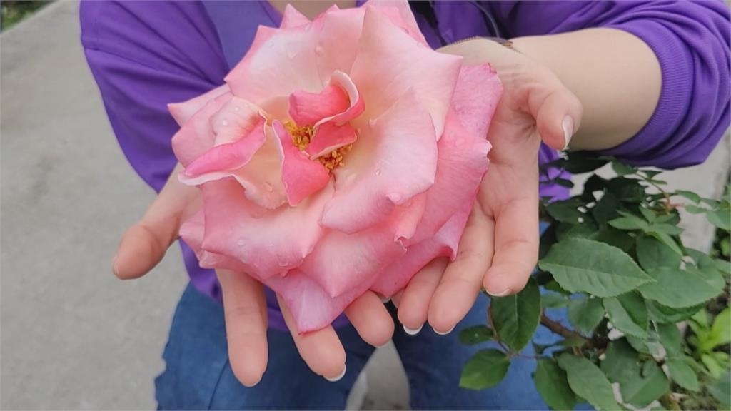 比臉還要大的玫瑰,你看過嗎?苗栗縣頭屋鄉一處玫瑰園,有一株名為「紀念日」的雜交玫瑰,因為今年天冷,長得特別大,花瓣展開長達20公分;而另外在雲林縣,也有一棵風鈴木,竟然只開了半邊,讓民眾戲稱像是「情侶樹」。