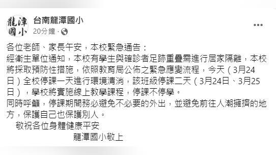 高雄、台南今日COVID-19出現變化,台南龍潭國小今日中午公告,有學生與確診者足跡重疊需進行居家隔離,本校將採取預防性措施,依照教育局公佈之緊急應變流程,今天全校停課一天進行環境清消,該班級停課二天(3月24日、3月25日),學校將實施線上教學課程,停課不停學。